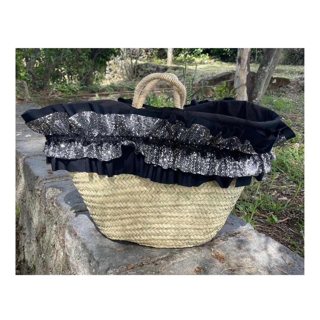 Natural palm bag from Morocco, handcrafted by skilled inland artisans with sisal handles. Black cotton lining, black lycra exterior, sequin trim and fabric. Measurements: length 58 cm, height 29 cm. Dimensions may vary slightly as they are handmade. For proper care, we recommend brushing, not washing. Matches the swimsuit.