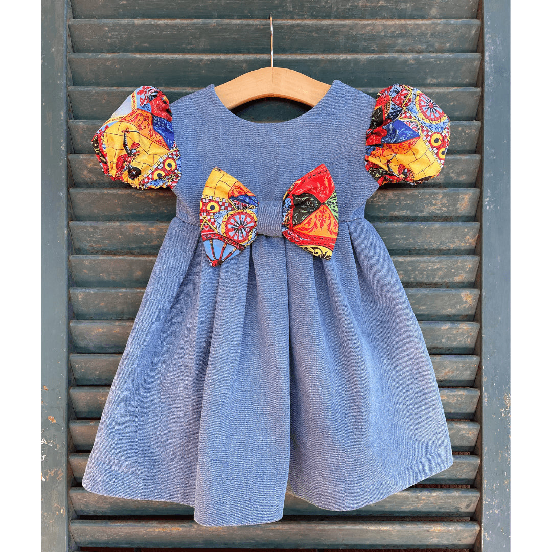Denim dress with puffed sleeves and a Sicilian-print bow appliqué. Slightly low-cut, wrap-over back. Available in matching mother-and-daughter styles.