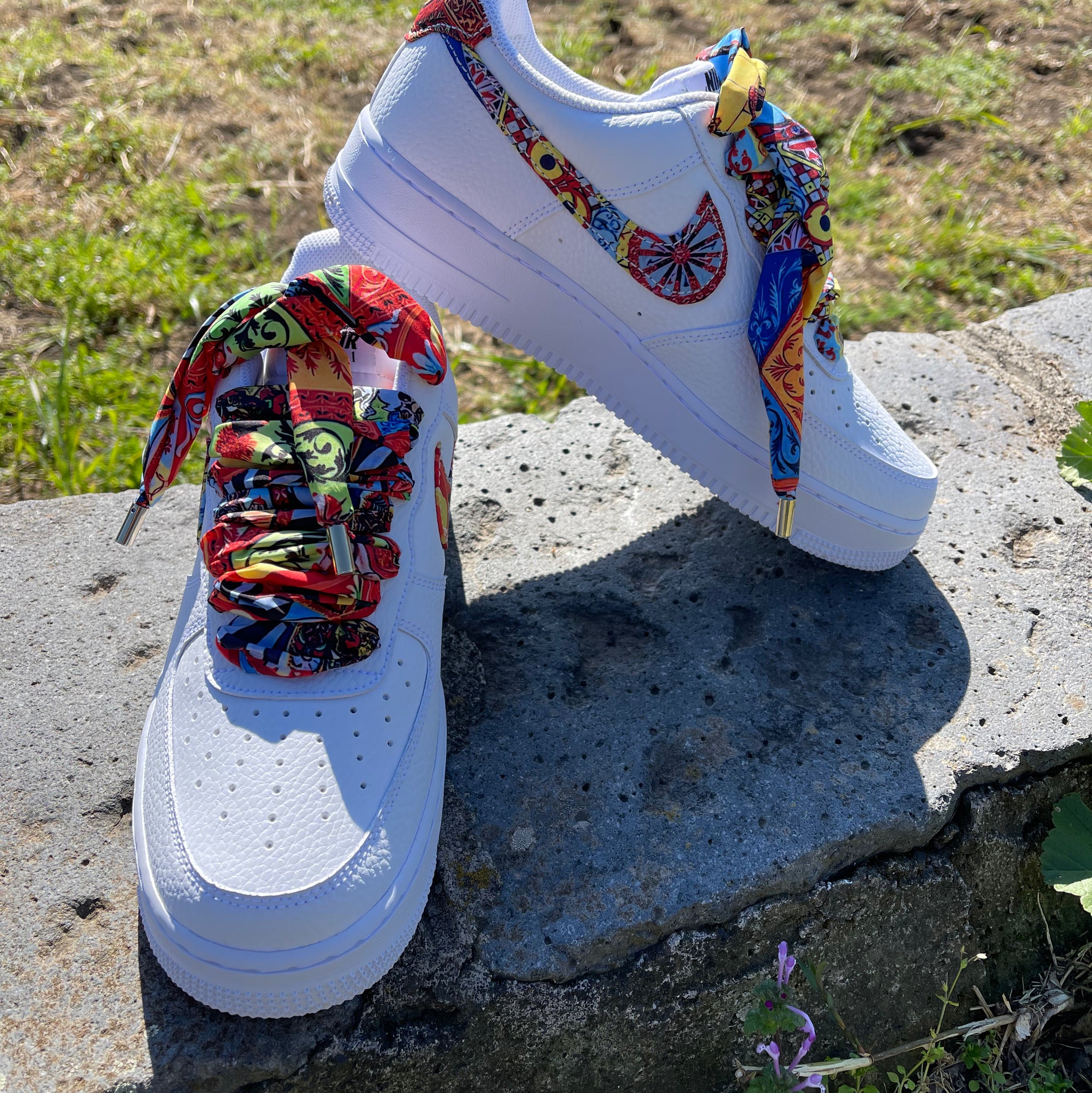 Custom Nike Air Force 1 shoes. The Nike logo and the back of the heel are finished with waterproof fabric inserts featuring a Sicilian print. Everything is sewn as it was in the factory. Even the laces are replaced with waterproof fabric . A free unisex Sicilian-print hooded rain jacket with elastic waistband and cuffs, zipper, and water-repellent and waterproof fabric is included. Tailored product and workmanship.