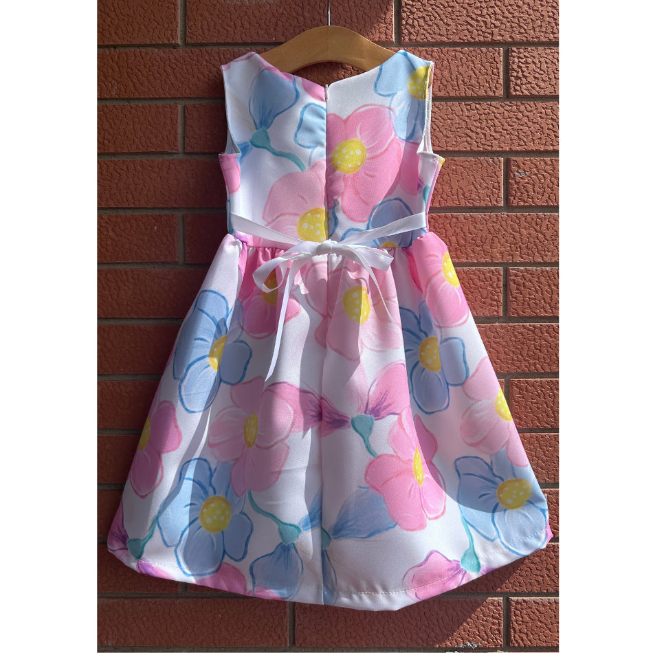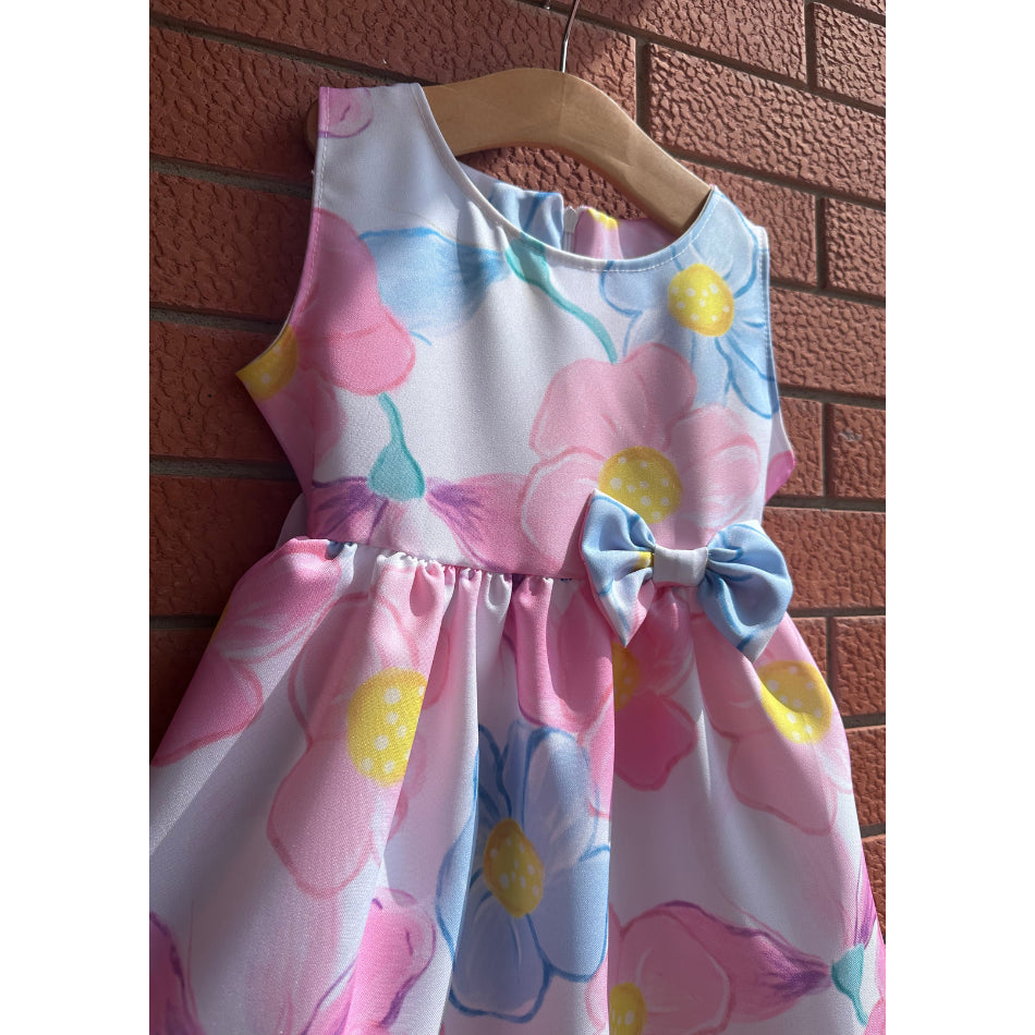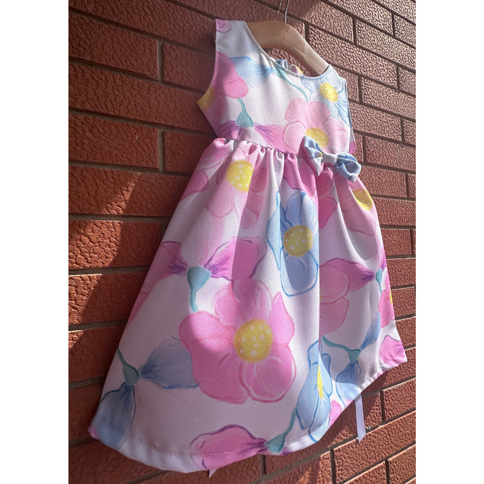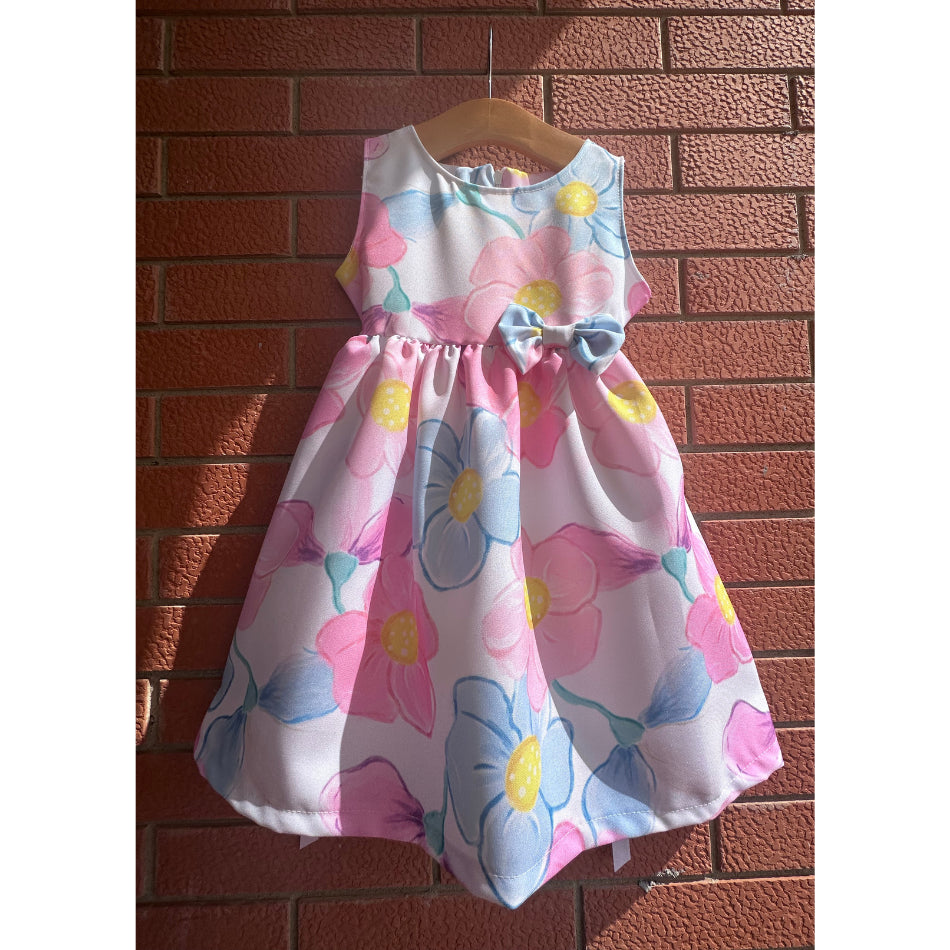Vestitino smanicato stampa floreale con fiocchettino in vita, dietro apertura cerniera e nastrino per stringere in vita.