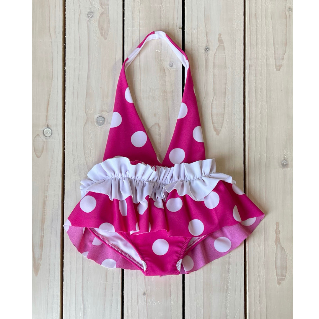 Costume da mare girocollo fantasia pois con rouches alla vita e dietro aperto. Tessuto in lycra elasticizzata internamente rivestito. Disponibile in coordinato mamma e figlia. Vestibilità regolare.