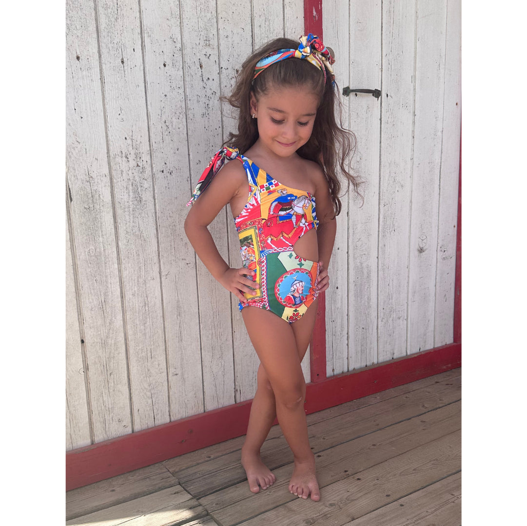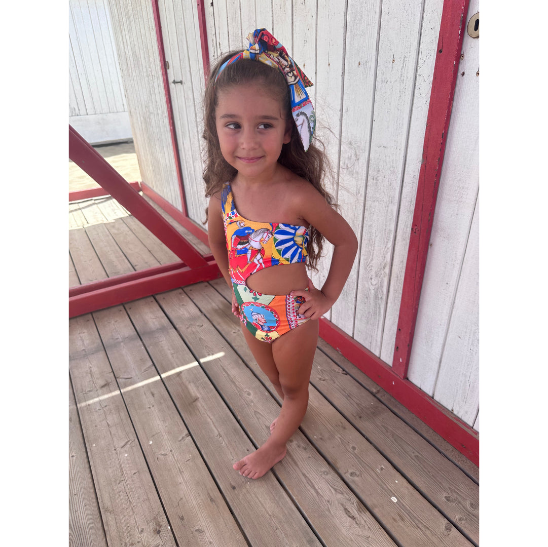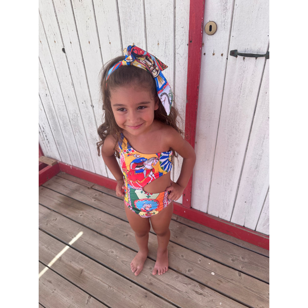 Costume da mare modello trikini mono spalla in tessuto lycra bielastico stampa siciliana. Taglio in vita e legatura su spalla con fiocco. Internamente rivestito in tessuto morbido leggero per un'asciugatura rapida. Taglio dietro disponibile solo classico. Disponibile in coordinato per tutta la famiglia.