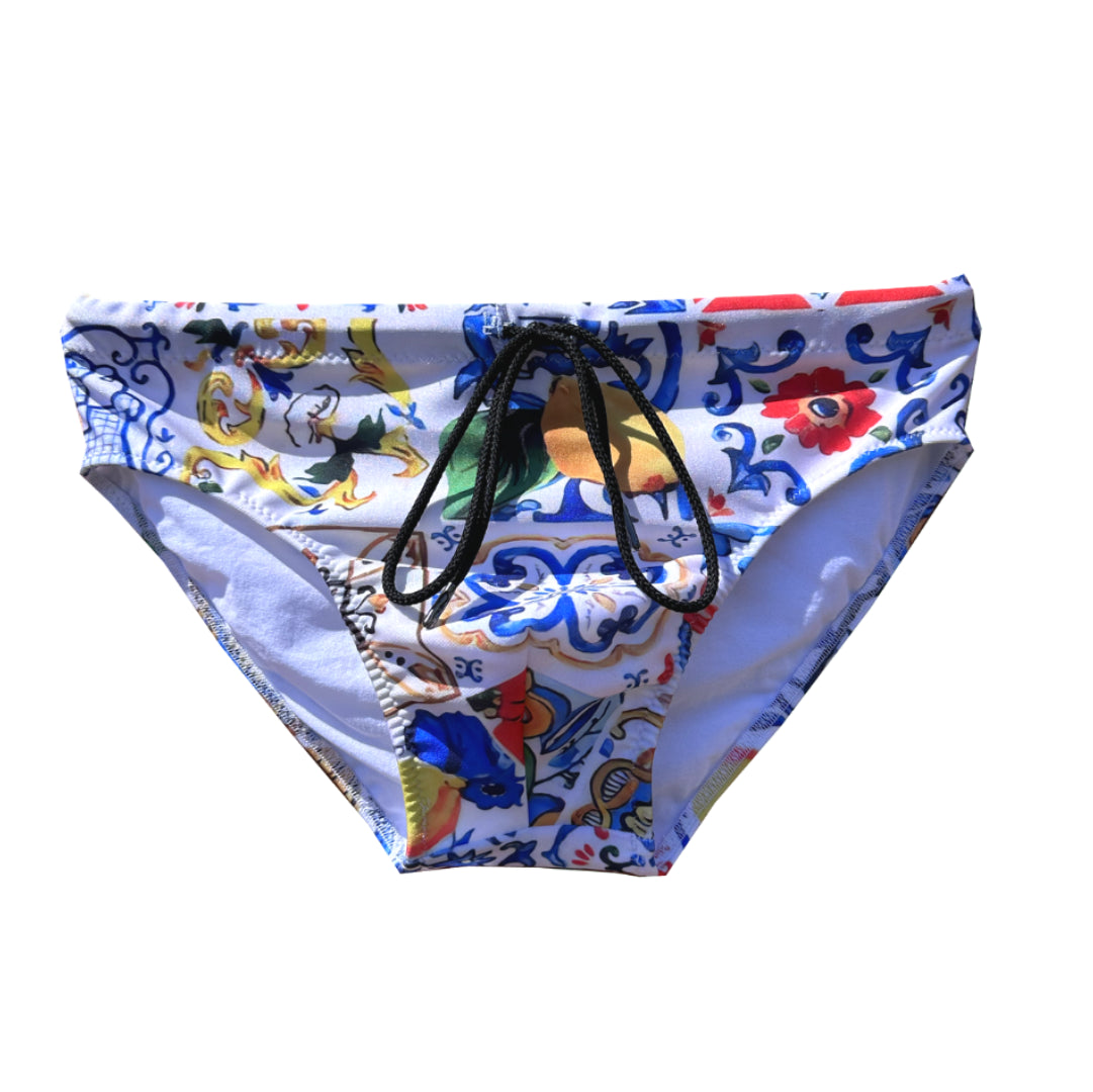 Costume da mare modello slip da uomo in lycra bielastica stampa siciliana. Internamente rivestito in tessuto poliammide morbido e per una facile asciugatura. Elastico in vita e laccetto per regolarlo leggermente. Disponibile in coordinato per tutta la famiglia.