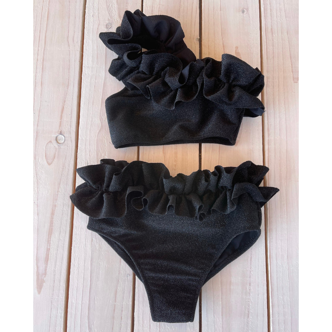 Costume da mare due pezzi sopra monospalla e sotto mutandina vita alta con rouches. in maglia base glitterata elastica internamente rivestito. Predisposto per inserire le coppe ma non incluse nel costume. disponibile in coordinato mamma e figlia.